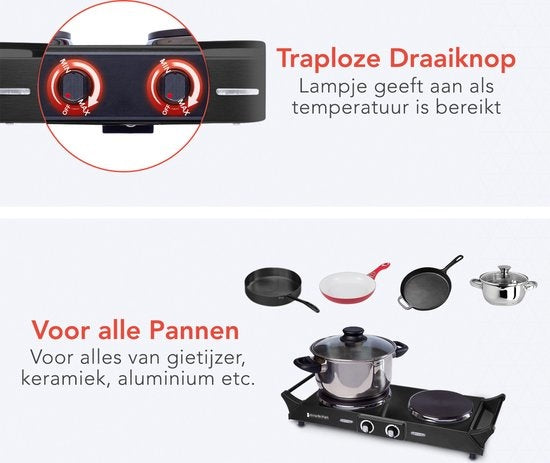 Innerhalb von 7 Minuten haben Sie einen Topf mit 1 Liter Wasser zum Kochen gebracht! Mit den Drehknöpfen können Sie die Hitze selbst einstellen. Das kleine Kochfeld hat eine Leistung von 1000 W und das große von 1500 W. Sobald Sie Ihre Wahl getroffen haben, wird der Brenner immer heißer, bis er die gewünschte Temperatur erreicht hat. Dann erlischt das rote Licht und der Brenner hält diese Temperatur. Auf diese Weise können Sie die Temperatur ganz einfach selbst regulieren und behalten die Kontrolle über Ihr Essen!