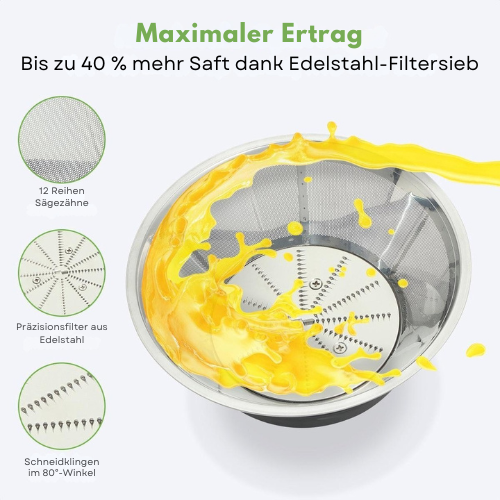 Obst und Gemüse enthalten viele Nährstoffe und Mineralien. Es wäre schade, wenn diese beim Entsaften verloren gehen würden. Dieser Entsafter ist so konzipiert, dass 20 % mehr Saft und 30 % mehr Vitamine und Mineralstoffe erhalten bleiben. So bleiben alle gesunden Stoffe erhalten!