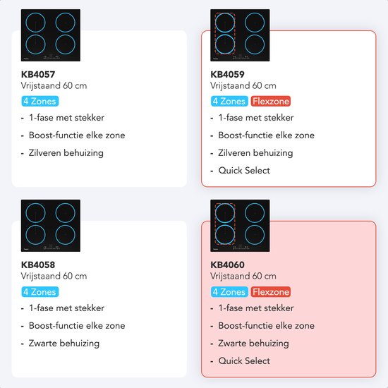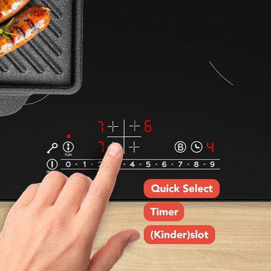 Das KitchenBrothers Induktionskochfeld verfügt über vier separate Kochzonen, so dass Sie mehrere Gerichte gleichzeitig zubereiten können. Jede Zone liefert eine Leistung von bis zu 2400 W, so dass Sie schnell Wasser zum Kochen bringen oder Fleisch richtig anbraten können. Damit ist dieses Induktionskochfeld perfekt für jeden Haushalt. Verbinden Sie zwei separate Kochzonen zu einer großen Flexzone, um zum Beispiel einen großen Grill zu verwenden. Dank der Boost-Funktion können Sie die Flex-Zone mit bis zu 3500W nutzen, perfekt zum Grillen.