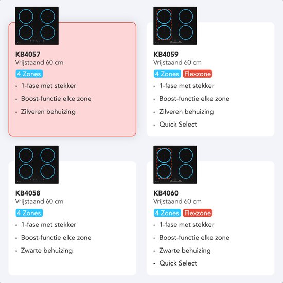 Schließen Sie das Kochfeld mit dem mitgelieferten Stecker an einen Phase 1 Anschluss an. Ein Phase 1 Anschluss bedeutet, dass das Kochfeld eine Standard-Stromversorgung (230V) verwendet. Die Kochzonen liefern 1200W (2x) und 2000W (2x) und sind damit ideal für die Zubereitung köstlicher Mahlzeiten.