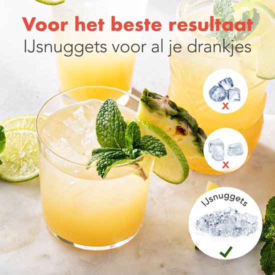 Die Nugget-Eiswürfelmaschine von KitchenBrothers ist eine unverzichtbare Ergänzung für Ihre Küche oder Party. Nugget-Eiswürfel sind perfekt für die Zubereitung von Cocktails, Softdrinks und Smoothies. Dank ihrer luftigen Struktur schmelzen diese Würfel schneller und gleichmäßiger, nehmen die Aromen besser auf und kühlen Ihr Getränk schnell. So wird jeder Schluck zu einem besonderen Genuss. Beachten Sie, dass sich Nuggeteis von gewöhnlichen Eiswürfeln unterscheidet; es ist wie Pellets geformt, schmilzt schneller und ist daher nicht immer für jede Art von (starkem) Getränk geeignet.rank. Für Liebhaber von süßen, fruchtigen Getränken wie Softdrinks, Cocktails, Smoothies und sogar selbstgemachten Slush Puppies ist dies die perfekte Wahl!