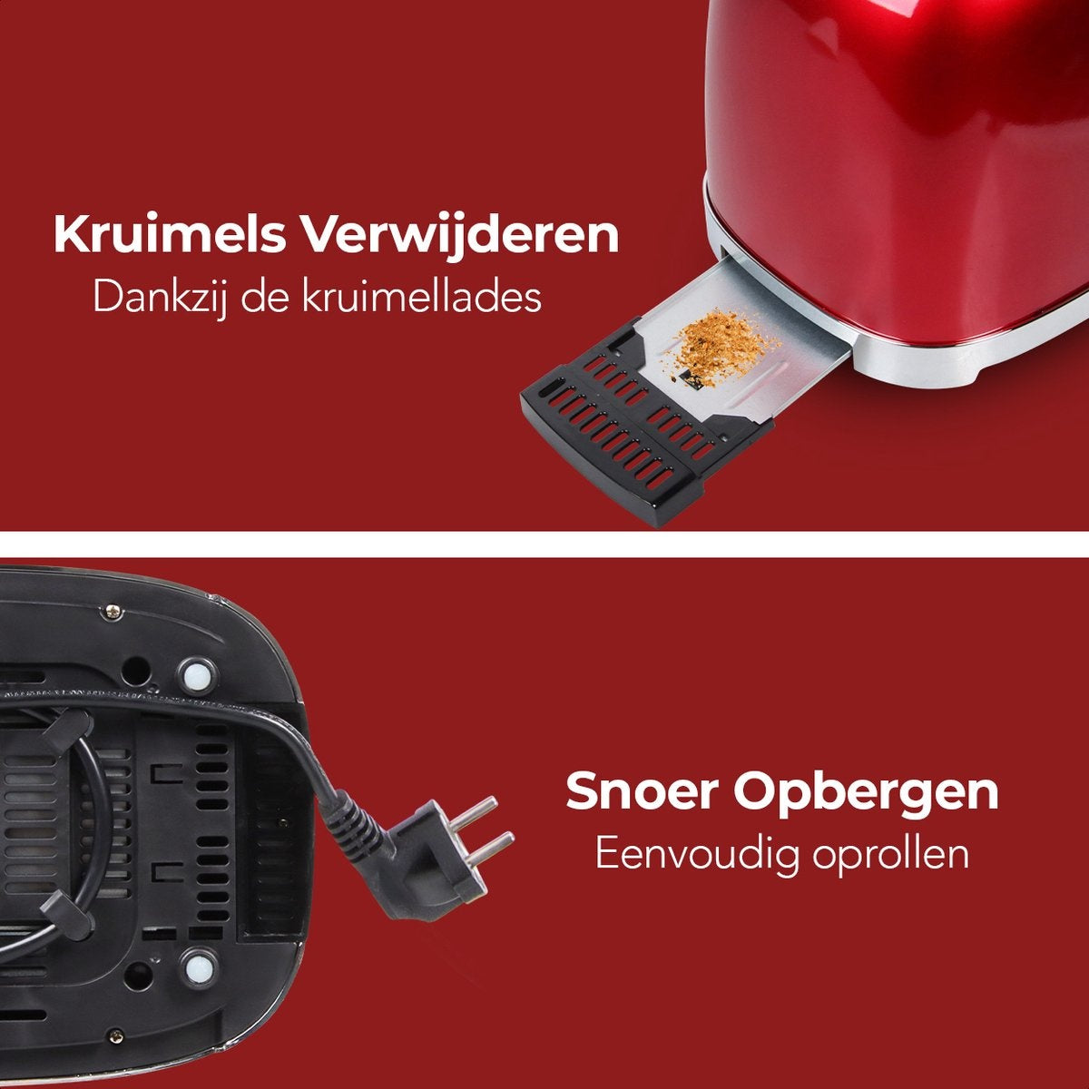 Suchen Sie einen stilvollen und praktischen Toaster? Bestellen Sie jetzt den Retro-Toaster von KitchenBrothers! Mit 3 Einstellungen (normal, aufwärmen, auftauen) und 6 Aufheizstufen können Sie Ihr Brot genau so toasten, wie Sie es mögen. Die breiten Schlitze eignen sich für alles zwischen normalem Brot, Bagels und sogar Gebäck. Das stilvolle Retro-Design passt zu jeder Einrichtung, von der modernen bis zur altmodischen Küche. Dank der Anti-Blockier-Funktion und dem extra hohen Hebemechanismus ist der Toaster sehr einfach zu bedienen. Dank der herausnehmbaren Krümelschublade und dem Kabelaufbewahrungsfach können Sie Ihre Küche auch leicht sauber und ordentlich halten.