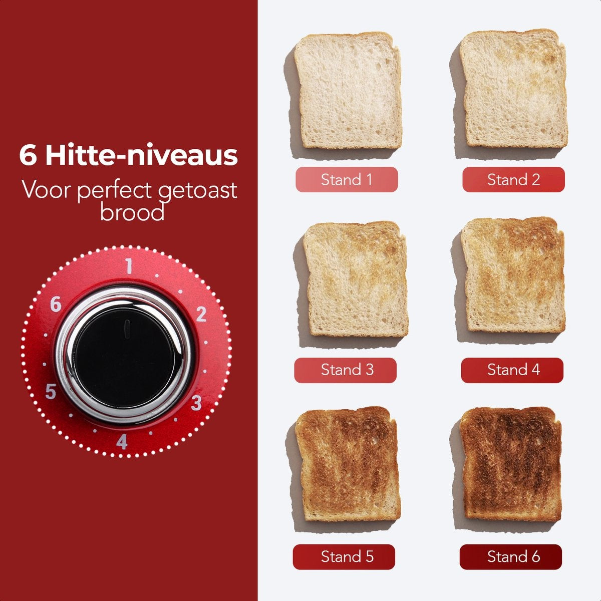 KitchenBrothers Retro-Toaster - 6 Heizstufen - 2 extra breite Schlitze - 1630W - Aufwärm- und Auftaufunktion - Rot