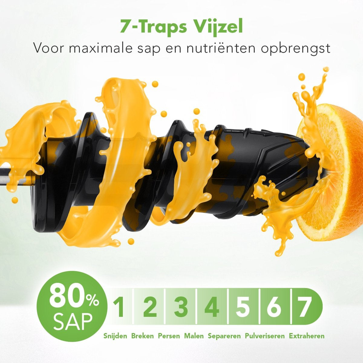Im Gegensatz zu einer Saftpresse presst der Slow Juicer die Zutaten bei niedriger Geschwindigkeit (80 U/min) durch eine Saftschnecke. Durch das Pressen mit niedriger Geschwindigkeit bleibt der Nährwert von Obst und Gemüse erhalten. Die Zellstruktur aller Vitamine, Enzyme und Mineralien bleibt intakt, wodurch der Saft länger haltbar ist. Auf diese Weise erhalten Sie weniger Schaum, mehr Saft und ein trockeneres Fruchtfleisch. Durch das Pressen bei niedriger Geschwindigkeit erhitzt sich der Saft nicht, und es kommt zu weniger Oxidation als bei einem Entsafter. Außerdem sind langsame Entsafter viel leiser als Entsafter (~70dB vs. ~90dB). So schön am Morgen!