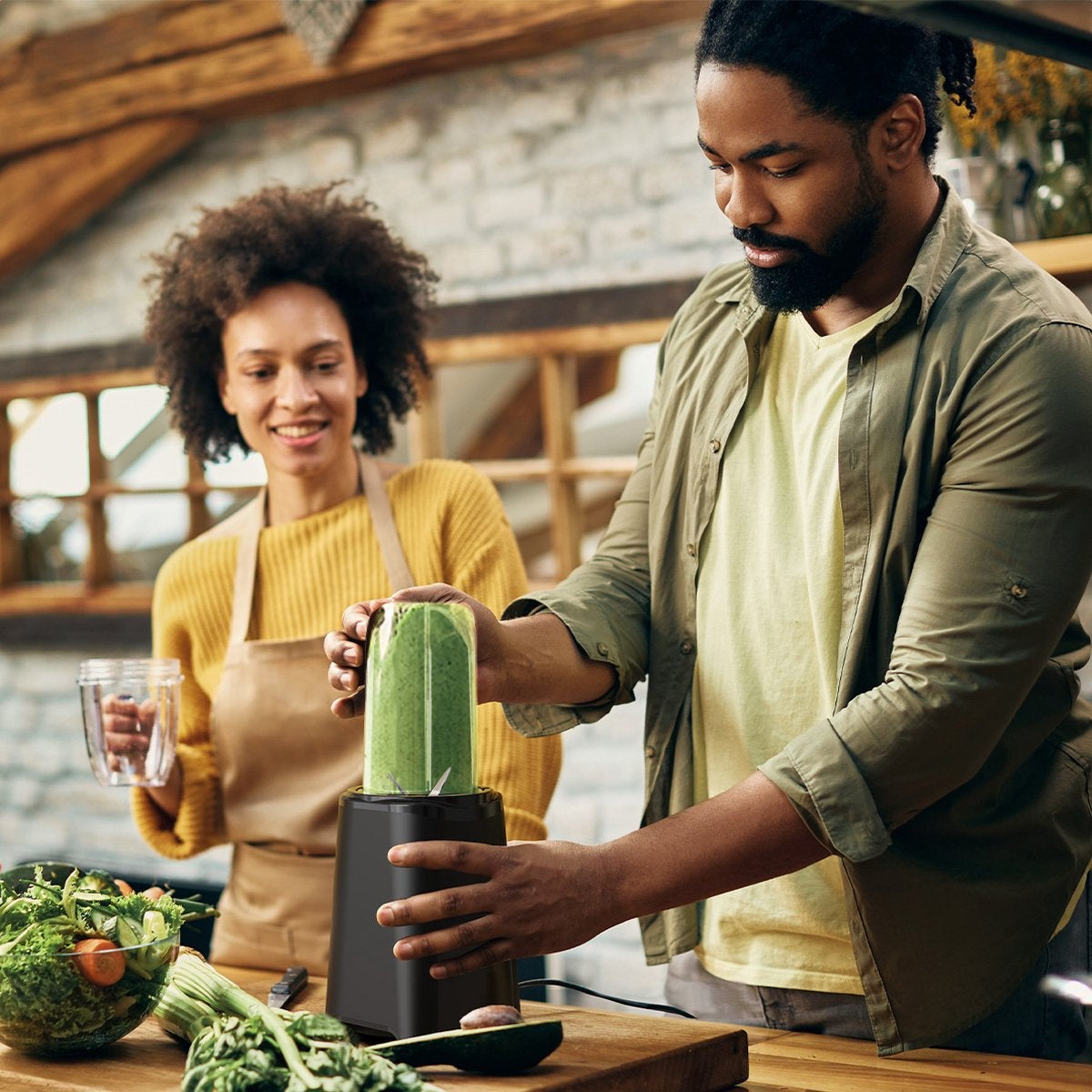 Der KitchenBrothers Smoothie Blender ist ein umfangreiches 13-teiliges Set mit 4 Bechern. Der leistungsstarke 350-W-Motor kann Lebensmittel wie Obst, Gemüse, Kaffeebohnen, Kräuter und sogar Eis zerkleinern, mischen und zermahlen. Mit der manuellen Pulsfunktion und den 2 Geschwindigkeitsstufen ist er einfach zu bedienen. Die BPA-freien Becher und wiederverschließbaren Deckel halten alles frisch und können einfach in die Spülmaschine gestellt werden. Mach dir die gesündesten Smoothies zum Mitnehmen, (Milch-)Shakes, Dressings oder frische Tapenaden schnell und einfach!