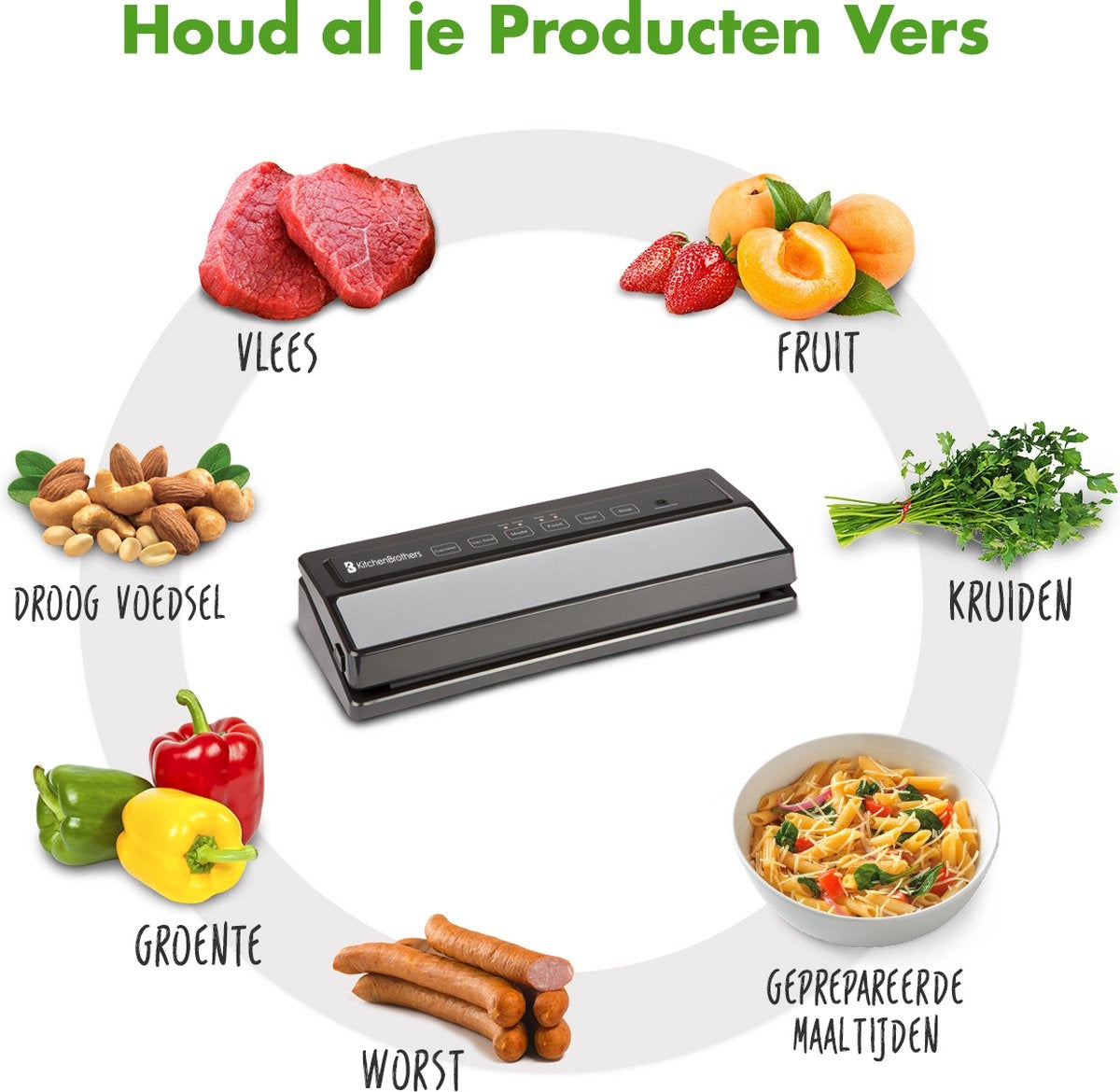 Wussten Sie schon, dass Sie mit dem KitchenBrothers Vakuumiergerät Ihre Lebensmittelabfälle reduzieren und Geld sparen können? Halten Sie Lebensmittel 5x länger frisch und ruinieren Sie nie wieder Lebensmittel aufgrund von Gefrierbrand. Lagern Sie Fleisch 2-3 Jahre, halten Sie geöffnete Weinflaschen länger haltbar oder garen Sie das perfekte Steak sous vide! Das Vakuumiergerät von KitchenBrothers ist unglaublich vielseitig! Das Vakuumiergerät hat 4 Einstellungen für trockene oder feuchte Lebensmittel. Vakuumieren Sie alles, von einer kompletten Fleisch- und Gemüsemahlzeit bis hin zu Chips oder Suppe!