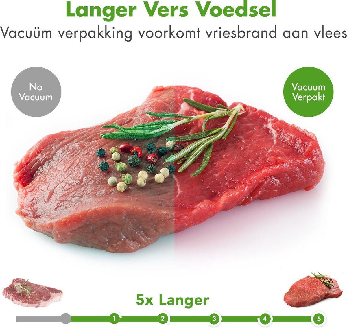 Vakuumverpackte Lebensmittel sind bis zu fünfmal länger haltbar. Die Lagerzeit von nicht vakuumverpacktem Fleisch im Gefrierschrank beträgt 6 Monate. Wussten Sie jedoch, dass Sie vakuumverpacktes Fleisch bis zu 2-3 Jahre aufbewahren können? Außerdem verhindert es Gefrierbrand an Fleisch und Brot. Es bilden sich keine schädlichen Eiskristalle, weil die Feuchtigkeit entzogen wurde. So schmecken die Lebensmittel länger frisch!
