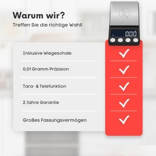 Die digitale Präzisionswaage von Kitchenwell ist das perfekte Küchengerät. Diese kompakte Waage macht es einfach, exakte Mengen zu messen. Diese multifunktionale Miniwaage kann auch zum Wiegen von Schmuck und Medikamenten verwendet werden. Außerdem bietet die Küchenwaage zwei praktische Funktionen! Mit der Tarafunktion und der Zählfunktion können Sie damit sogar Schrauben zählen!