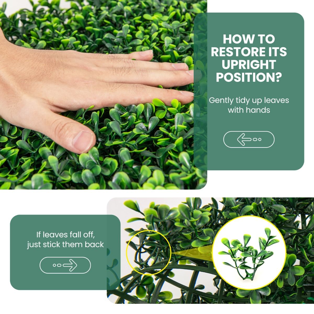 Diese Kunstgras-Wandpaneele sind vielseitig einsetzbar. Verwenden Sie sie als Sichtschutz, Kulisse für Hochzeiten und Partys oder als stilvolle Wanddekoration in Ihrem Haus, Büro oder Geschäft. Die Pflege ist einfach, schütteln Sie die Paneele nach dem Transport oder passen Sie die Blätter von Hand an, damit sie wieder perfekt fallen.