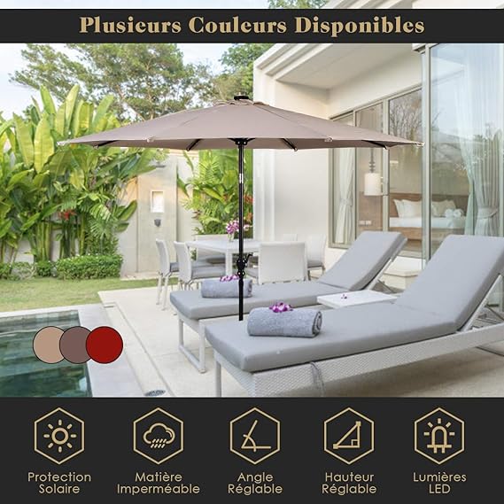Der Sonnenschirm ist ein idealer Schattenspender für Balkon, Garten, Markt, Strand, Terrasse. Er bietet optimalen Schutz vor Sonneneinstrahlung. Dank seines intelligenten Designs steht er nicht im Weg und kann optimal an die Sonnenverhältnisse angepasst werden. Dank der LED-Beleuchtung können Sie ihn auch nachts nutzen.