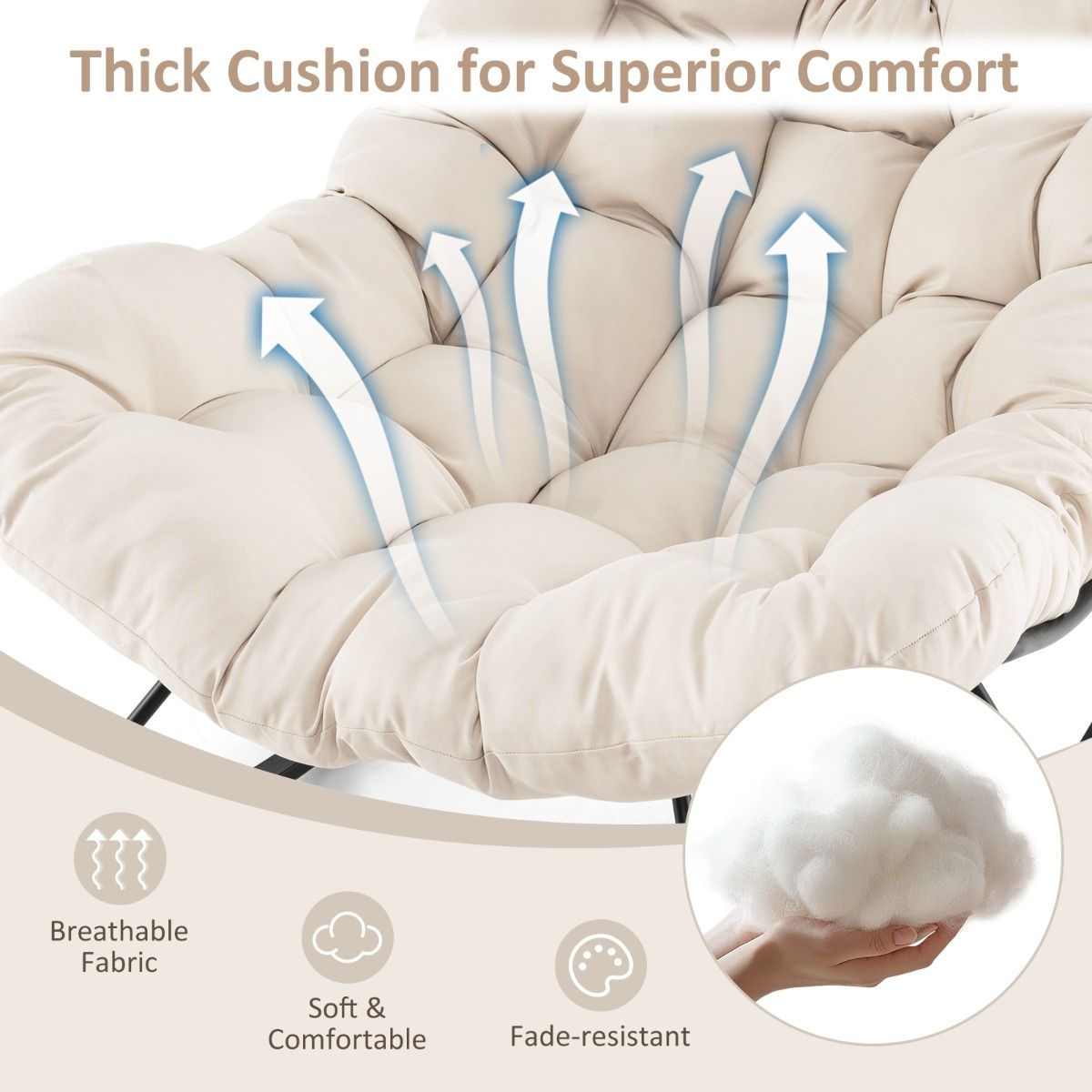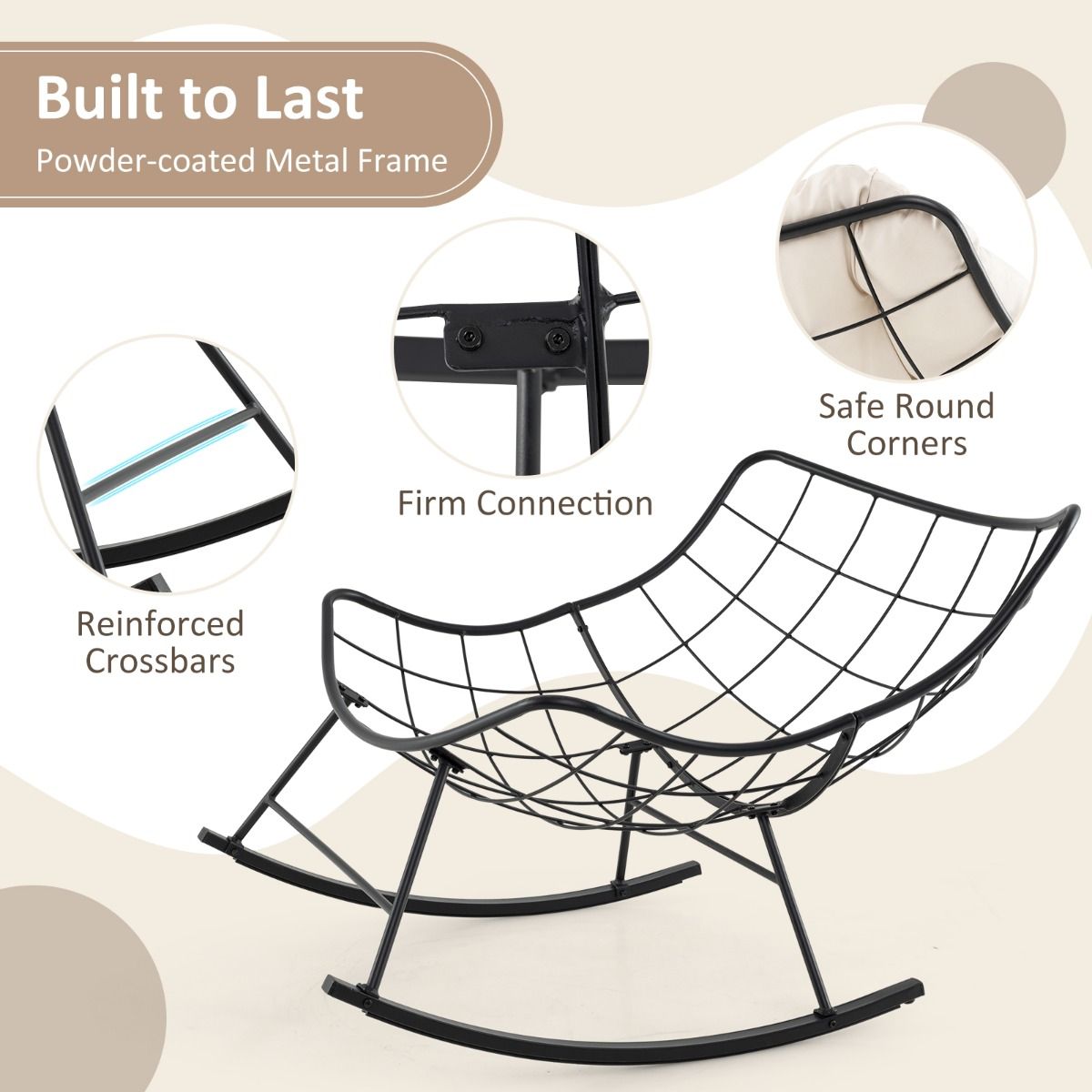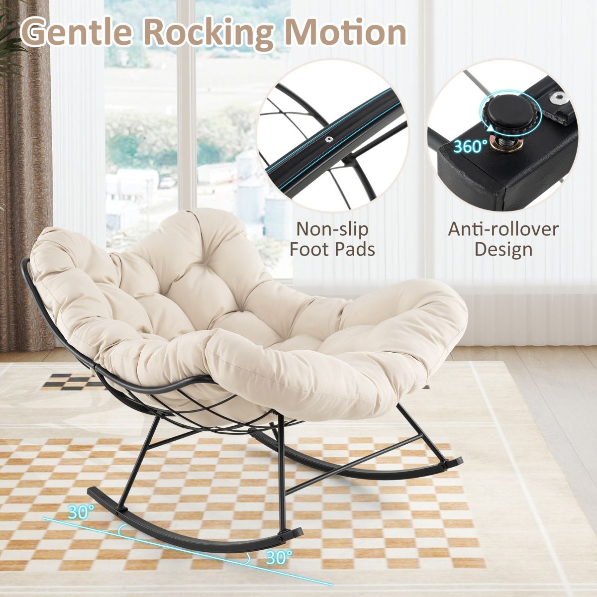 Mit seinem eleganten beigen Kissen und dem schwarzen Gestell passt dieser Schaukelstuhl perfekt in jedes Ambiente - vom modernen Wohnzimmer bis zur sonnigen Terrasse oder gemütlichen Leseecke. Verwenden Sie ihn drinnen oder draußen, aber schützen Sie den Stuhl vor Regen, um seine Lebensdauer zu verlängern.