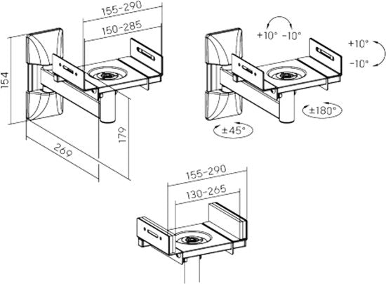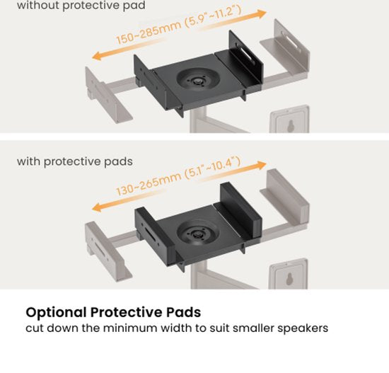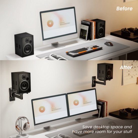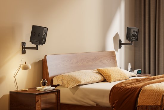 Dieses Set aus zwei Lautsprecher-Wandhalterungen bietet vielseitige Einstellmöglichkeiten und eignet sich daher für Lautsprecher verschiedener Marken. Sie sind drehbar und positionierbar und tragen so zu einem optimalen Hörerlebnis bei. Dank der ausziehbaren Klemmstruktur mit rutschfesten Pads auf beiden Seiten können Lautsprecher verschiedener Größen sicher an der Halterung befestigt werden. Die Plattform ist um 360° drehbar und kann um bis zu 10° in horizontaler und vertikaler Richtung geneigt werden. Der Schwenkarm mit versteckter Kabelführung ermöglicht zudem eine besonders flexible Aufstellung und ein aufgeräumtes Erscheinungsbild rund um die Lautsprecher. Geeignet für Lautsprecher mit einer Größe von 13 cm bis 28 cm und einem maximalen Gewicht von 25 kg pro Stück.