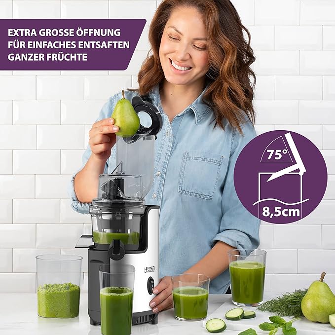 Der Lebenlang Slowjuicer ist die ideale Wahl für alle, die Obst und Gemüse auf besonders nährstoffschonende Weise entsaften möchten. Durch die langsame Pressmethode bleiben Vitamine, Enzyme und Aromen optimal erhalten. Egal ob Sellerie, Karotten, Äpfel oder Blattgemüse – der Slowjuicer erzielt eine maximale Saftausbeute bei minimaler Verschwendung.
