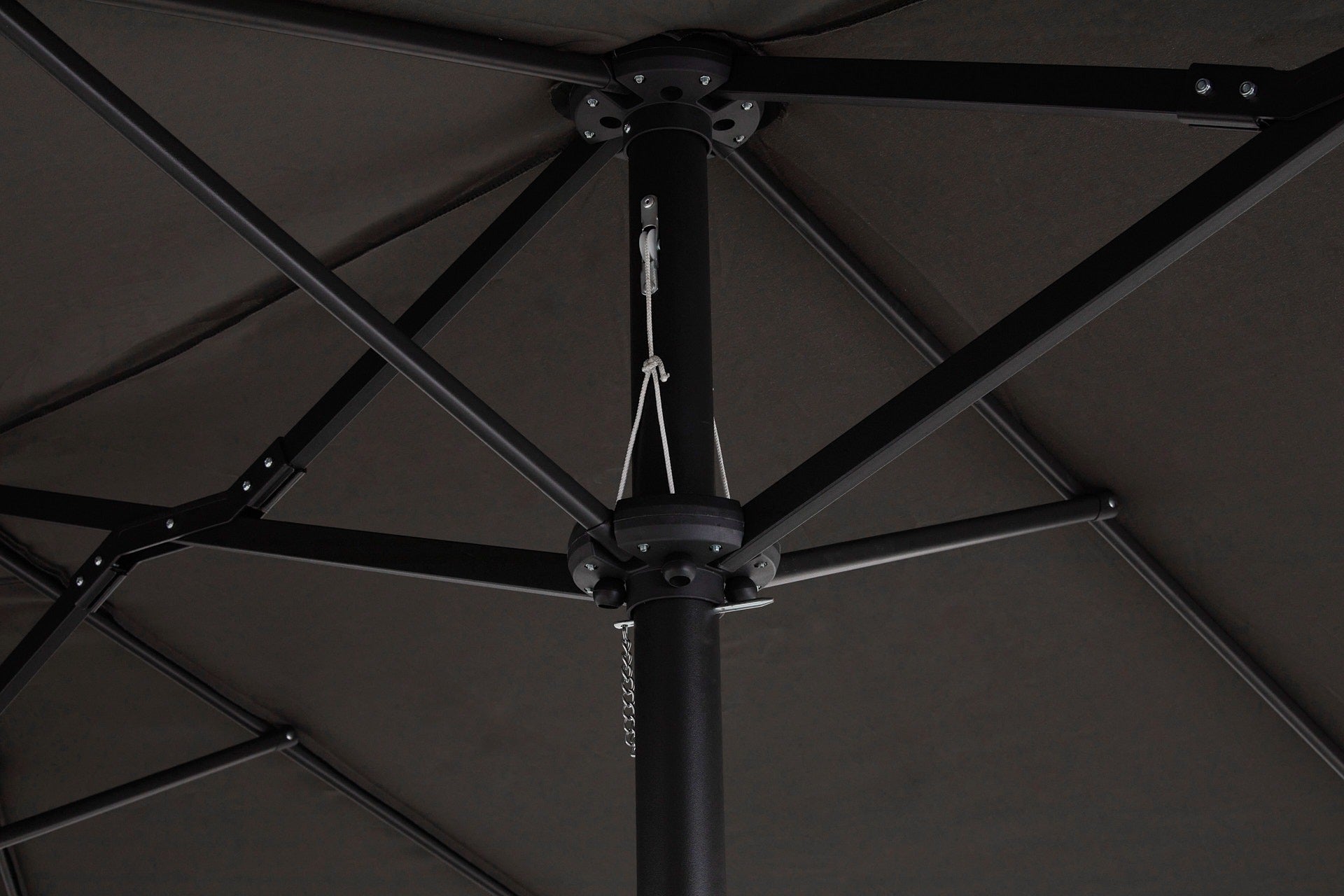 Mit einer Größe von 450x265x240 cm schafft dieser Doppel-Sonnenschirm eine große Schattenfläche, ideal für Esstische, Lounge-Sets oder Entspannungsbereiche im Garten. Die anthrazitfarbene Oberfläche verleiht ihm ein modernes und elegantes Aussehen, das perfekt zu jeder Außendekoration passt.