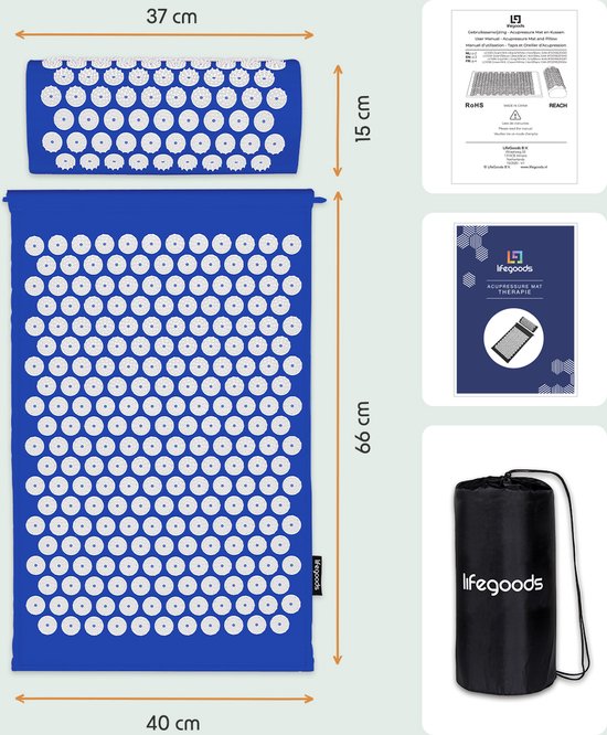 Genießen Sie vollkommene Entspannung mit der LifeGoods Akupressurmatte und dem Kissen! Verbringen Sie nur 20 Minuten pro Tag auf dieser Matte und Sie werden bald die Vorteile bemerken. Die Tausenden von Druckpunkten bieten eine effektive Stimulation für Ihren Körper. Mit den mitgelieferten Triggerpunkt-Massagekugeln erreichen Sie selbst die schwierigsten Druckpunkte. Dank des praktischen Anleitungsheftes lernen Sie die besten Massagetechniken, und die Tragetasche macht es einfach, das Set mitzunehmen, um die Vorteile der Akupressur mit Freunden und Familie zu genießen.