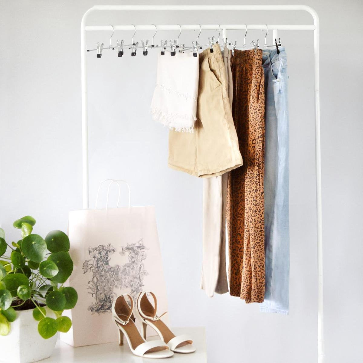 Schaffen Sie mit den verstellbaren Hosenbügeln ganz einfach einen klaren Überblick über alles, was in Ihrem Kleiderschrank hängt. Die Bügel sind aus stabilem Metall gefertigt und verfügen über kräftige, rutschfeste Klammern mit einer Tragkraft von 3 kg. Da die Klammern verstellbar sind, können Sie den Bügel auch für andere Kleidungsstücke und Textilien aller Größen verwenden. Kurzum, ideal für die Organisation Ihres Kleiderschranks!