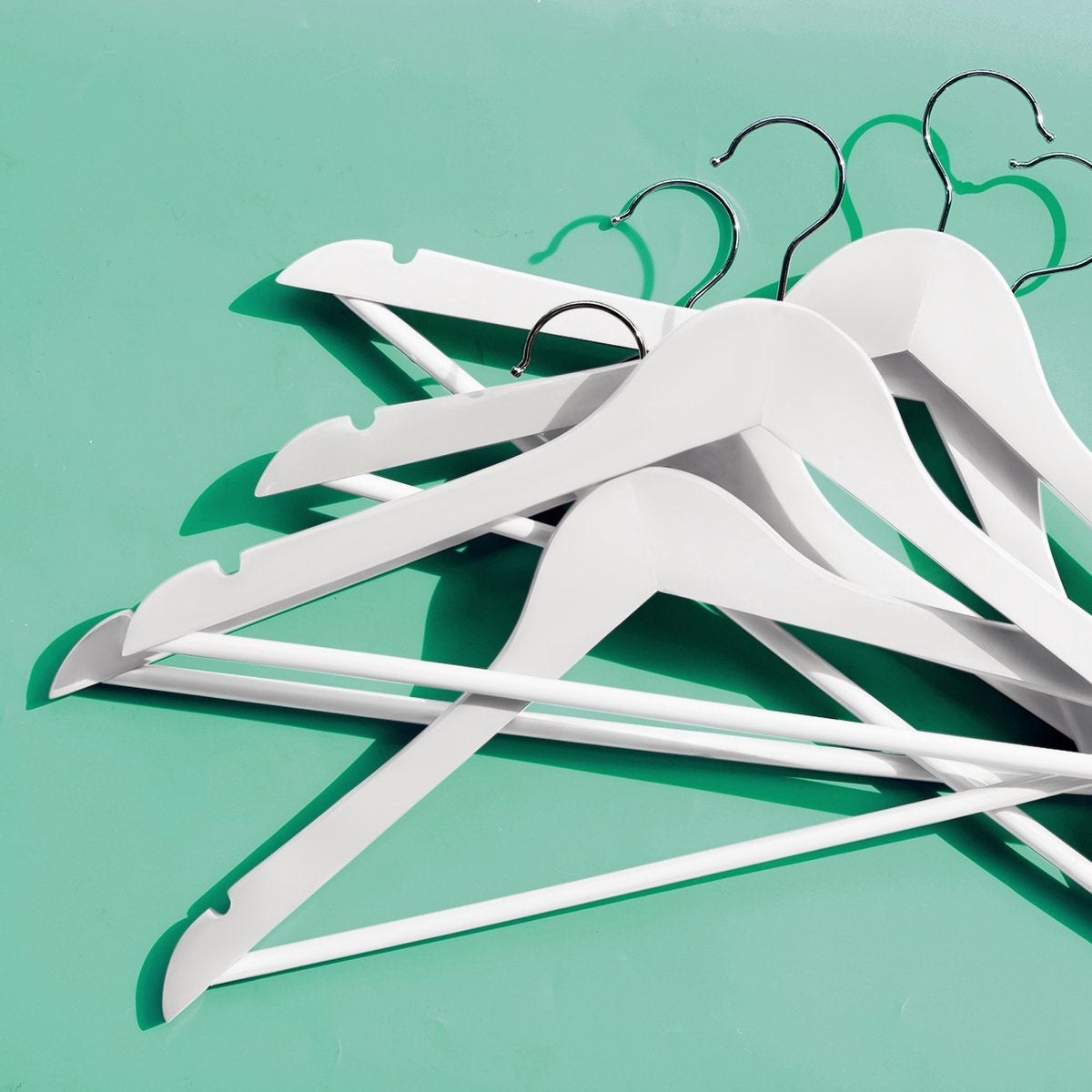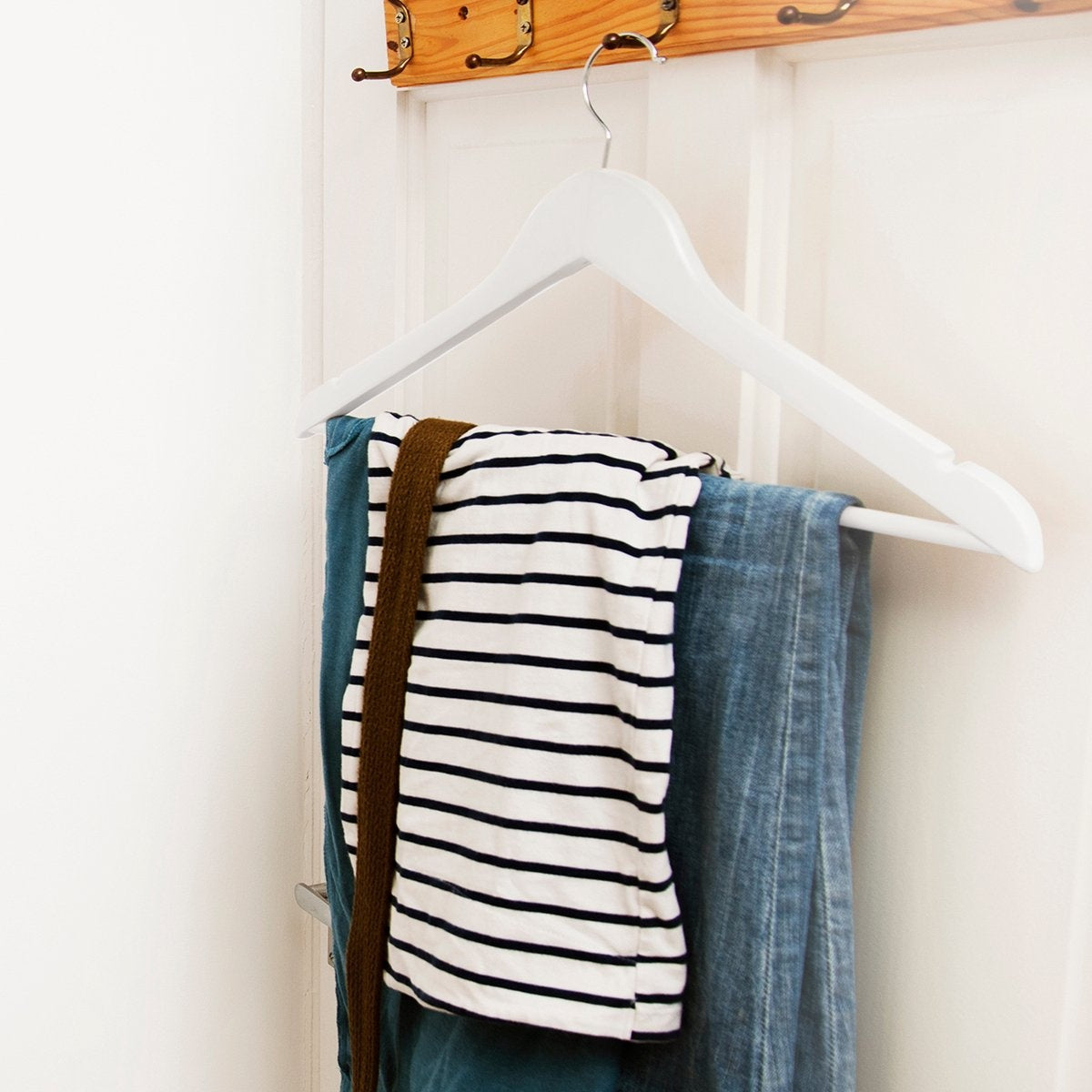 Die Kleiderbügel haben zwei Einkerbungen, die das Aufhängen von Kleidungsstücken mit dünnen Trägern, wie Hemden oder Kleidern, erleichtern. Darüber hinaus haben die Kleiderbügel eine praktische Hosenleiste für Hosen, Röcke oder Schals. Das ist nicht nur sehr praktisch, die Hosenleiste reduziert auch die Knitterfalten, die beim Zusammenlegen der Kleidung im Schrank entstehen.