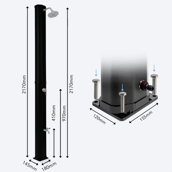 Freuen Sie sich auch auf Sonne, Schwimmen und Urlaub? Dann nehmen Sie die LifeGoods Außendusche mit in den Sommer! Die Dusche wird mit Solarenergie betrieben, wodurch sie sich selbst erwärmt und klimaneutral ist. Die robuste Metallgrundplatte sorgt für eine sichere und stabile Dusche. Die Outdoor-Dusche ist sehr einfach auf- und abzubauen, und dank der praktischen Abdeckung kann die Dusche einfach draußen stehen bleiben. Perfekt für Camping, am Pool oder im Garten.