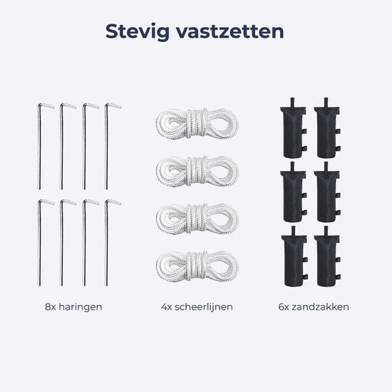 Das Partyzelt wird mit zus√§tzlichem Zubehör geliefert, um es am Boden zu befestigen. 4 Sands√§cke werden mitgeliefert, um das Ganze zu beschweren. Sie können die Sands√§cke selbst mit bis zu 10 kg befüllen. Au√üerdem werden 8 Heringe und 4 Abspannleinen mitgeliefert, um den Zeltstoff straff zu ziehen. Da das Partyzelt keinen starken Winden standh√§lt, wird auch eine praktische Tragetasche zur Aufbewahrung mitgeliefert. Die Konstruktion des Partyzeltes ist sehr stabil und robust. Alle Ecken sind mit einer zus√§tzlichen Lage Stoff verst√§rkt. Die Plane des Partyzeltes besteht aus dickem Polyester mit Nylon. Der robuste Stahlrahmen in Kombination mit der starken Harmonika-Konstruktion sorgt dafür, dass dieses Partyzelt einiges aushalten kann!