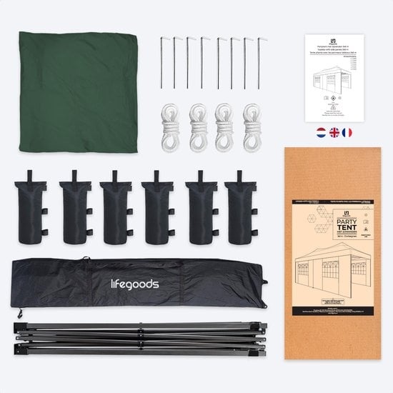 Lassen Sie sich Ihre Party nicht von greller Sonne oder Regen ruinieren! Dieses Partyzelt von LifeGoods ist die perfekte Lösung! Das Zelt misst 300 x 600 cm und ist in der Höhe verstellbar (305-315-325 cm). Das Partyzelt ist 100% wasserdicht, Regen ist also kein Problem. Dank des Pop-up-Gest√§nges aus Stahl l√§sst sich das Zelt in wenigen Minuten aufstellen! Party vorbei? Verstauen Sie das Partyzelt in der stabilen Tragetasche mit Rollen. Au√üerdem ist das Partyzelt verst√§rkt und wird mit Abspannleinen, Heringen und Sands√§cken geliefert.