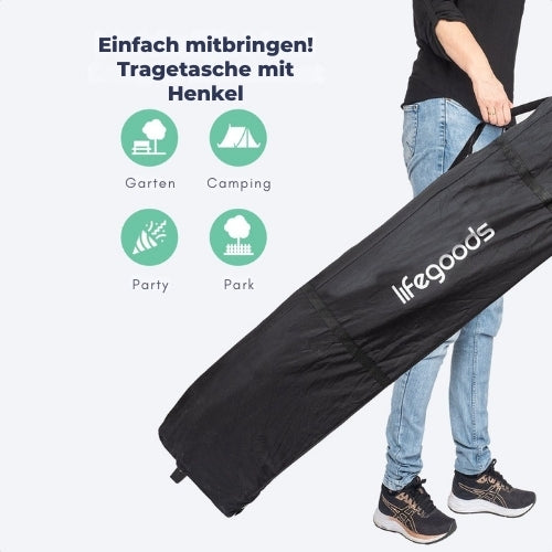 Lassen Sie sich Ihre Party nicht von greller Sonne oder Regen ruinieren! Dieses Partyzelt von LifeGoods ist die perfekte Lösung! Das Zelt misst 300 x 300 cm und ist in der Höhe verstellbar (240-250-260 cm). Groß genug für eine gemütliche Party! Dank des Pop-up-Gestänges aus Stahl lässt sich das Zelt in wenigen Minuten zusammenfalten! Verstauen Sie das Partyzelt in der stabilen Tragetasche. Sie können das Partyzelt auf Gras, Sand und härteren Untergründen aufstellen. Außerdem ist das Partyzelt verstärkt und wird mit Abspannleinen und Heringen geliefert.