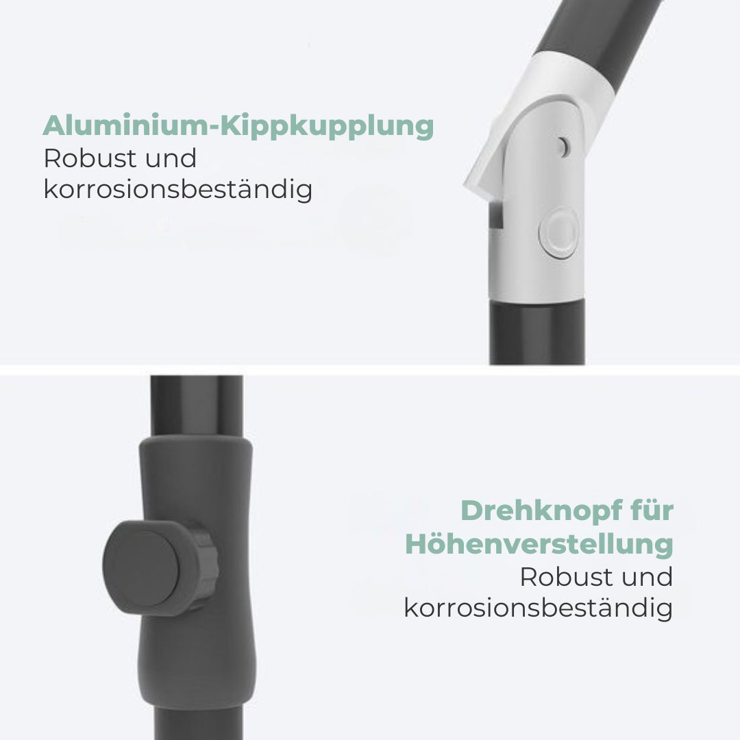 Der Sonnenschirm ist aus robustem Material gefertigt. Der Metallmast ist an der Unterseite 32 mm und an der Oberseite 28 mm dick. Das Gelenk besteht aus Aluminium und ist daher sehr robust und korrosionsbeständig. Die vier Metallrippen sorgen dafür, dass das Tuch straff bleibt. Außerdem besteht der Stoff aus dickem, wasserdichtem Polyester. So sind Sie vor Wind und Wetter geschützt!
