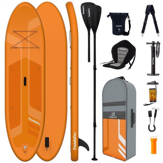 LifeGoods SUP Board - Deluxe Set - mit Sitz - Aufblasbares Paddle Board - Max. 135KG - 320x81cm - Orange