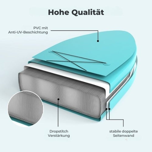 Das LifeGoods SUP-Board ist aus robustem, kratzfestem und UV-beständigem EVA-Schaum gefertigt. Dadurch hält das Board bis zu 135 kg aus! Die drei Finnen an der Unterseite des Boards sorgen dafür, dass Sie immer stabil sind. Die große, mittlere Finne kann abgenommen werden, um das SUP-Board wieder richtig zusammenzulegen. Das Board hat außerdem eine rutschfeste Oberfläche, so dass es nicht rutschig wird, wenn Wasser auf das Board kommt.