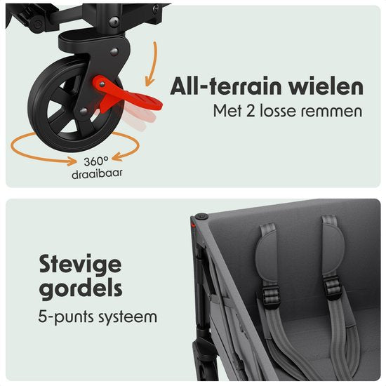 Der Wagen ist mit 5-Punkt-Gurten ausgestattet, d.h. der Gurt verläuft über die Schultern, die Hüften und zwischen den Beinen der Kinder. Das bietet maximale Sicherheit und sorgt dafür, dass Ihre Kinder auch auf holprigen Wegen fest an ihrem Platz bleiben. Sicherheit steht an erster Stelle, damit Sie Ihre Kinder sorgenfrei transportieren können.