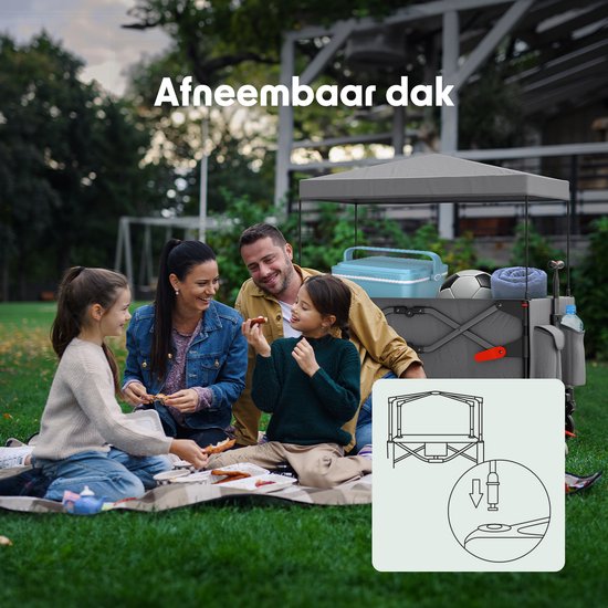 Das Dach des Strandwagens ist abnehmbar und hat einen UV 50+ Sonnenschutz, der die schädlichen Auswirkungen der Sonne reduziert. Außerdem ist das Dach wasserabweisend, so dass Ihre Kinder bei einem unerwarteten Regenschauer trocken bleiben.