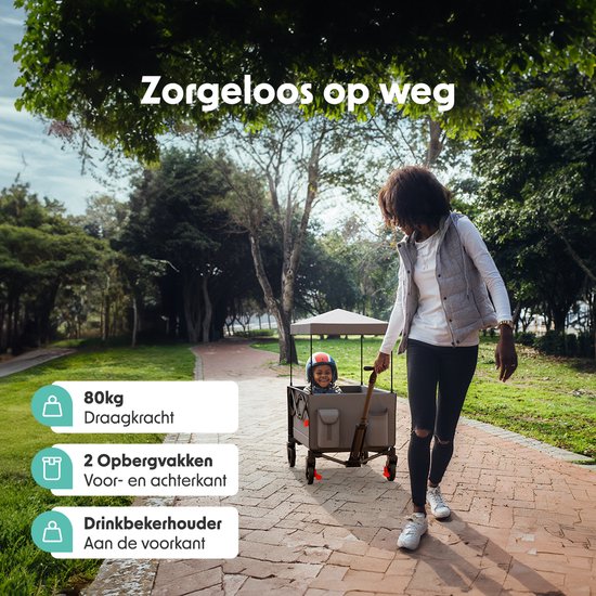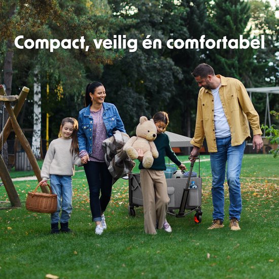 Mit dem LifeGoods Bolderkar wird jeder Familienausflug einfacher. Dieser faltbare Wagen ist ideal für Ferien und Ausflüge in den Park, zum Strand oder in den Zoo. Mit den geländegängigen PU-Lederrädern, dem großzügigen Stauraum und dem abnehmbaren Dach sind Sie bestens gerüstet. Außerdem sorgen die 5-Punkt-Gurte dafür, dass sich Ihre Kinder wohlfühlen.