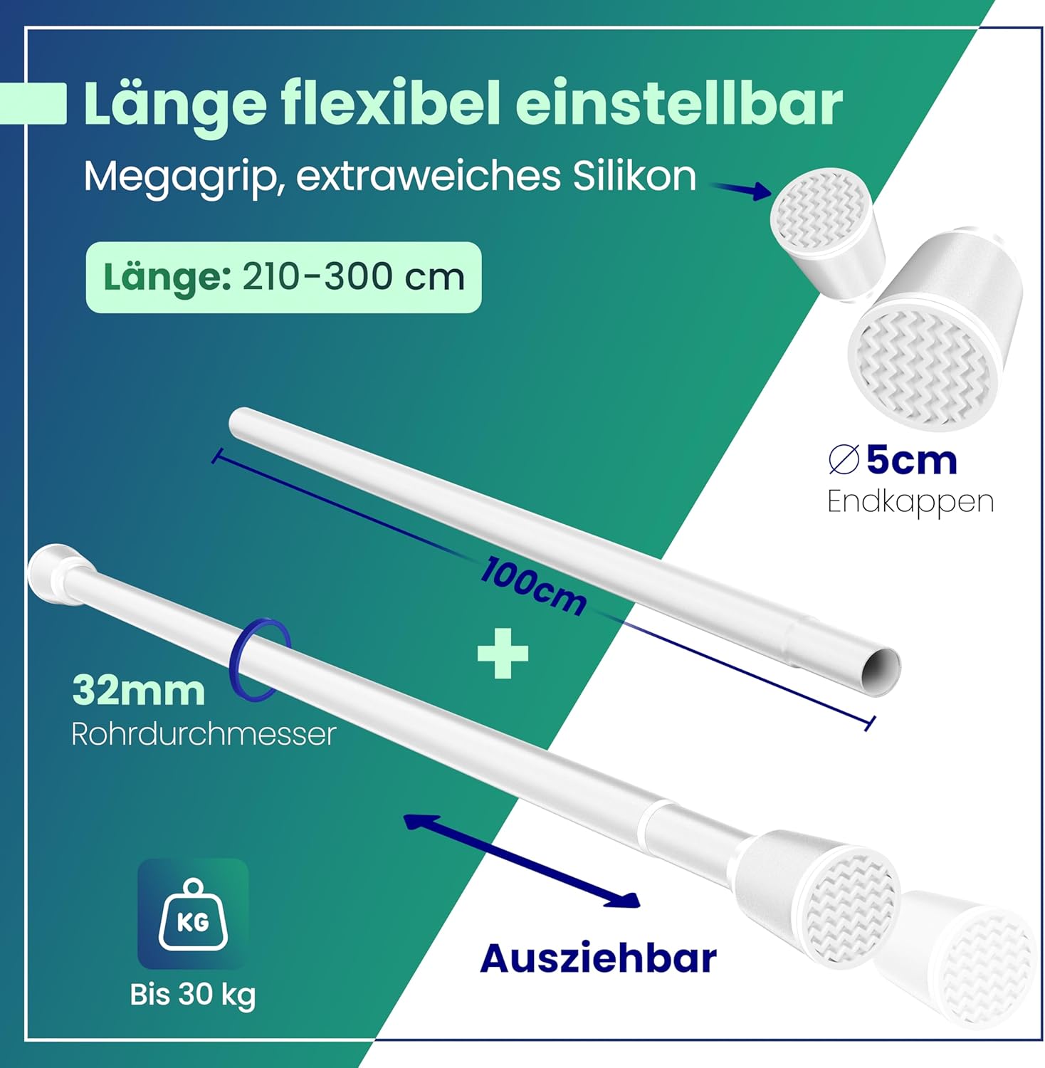 LOBUX® - Gardinenstange ohne Bohren [weiß, 210-300cm] - Teleskopstange Gardinenverlängerung - Duschstange ohne Bohren - Gardinenstange, Duschvorhangstange, Kleiderstange, Klemmstange Katzennetz