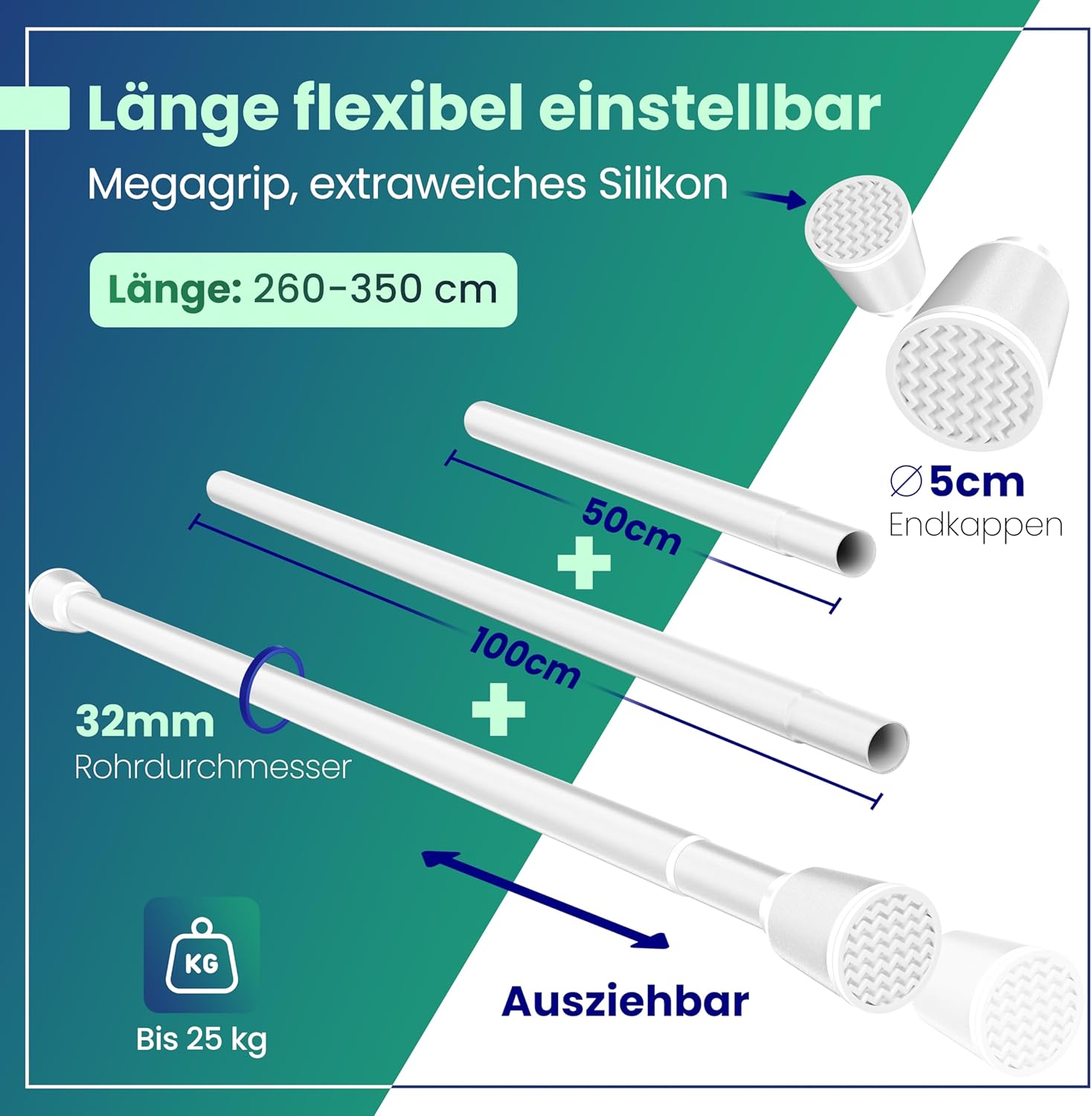 - ✅ Edelstahl - Dank der Kombination aus Karbonstahl und einer extra dicken Pulverbeschichtung ist die Klemmstange auch für Bad und Dusche bestens geeignet.