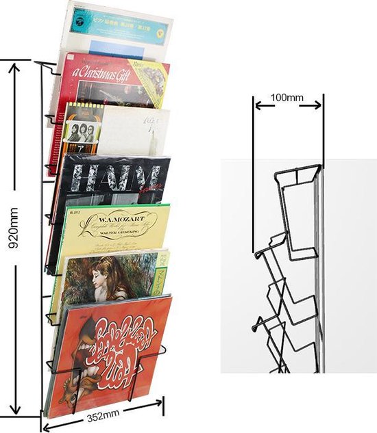 Ein stilvolles und funktionelles Wandregal zum Ordnen und Präsentieren von etwa 50 Schallplatten. Jedes der 6 Fächer bietet Platz für etwa 8 bis 9 12-Zoll-Schallplatten. Dieses Schallplatten-Wandregal ist aus leichtem, schwarzem, epoxidbeschichtetem Stahl gefertigt, was sowohl Haltbarkeit als auch ein attraktives Design gewährleistet. Sie können diese LP-Wandständer auf verschiedene Weise kombinieren und erweitern. Dieses Plattenregal ist ein unverzichtbarer dekorativer und funktioneller Artikel für Ihren Plattenspieler oder Ihr Wohnzimmer. Farbe: schwarz. Abmessungen: Breite 35 cm x Tiefe 10 cm x Höhe 92 cm.