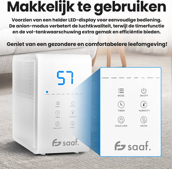 Der Saaf Luftentfeuchter ist die perfekte Lösung für alle, die die Luftfeuchtigkeit reduzieren und die Raumluftqualität verbessern wollen. Dieses leistungsstarke Gerät wurde entwickelt, um eine gesündere und angenehmere Wohnumgebung zu schaffen. Mit seinem kompakten Design und den benutzerfreundlichen Funktionen ist dieser Luftentfeuchter ideal für Räume von bis zu 35 m².