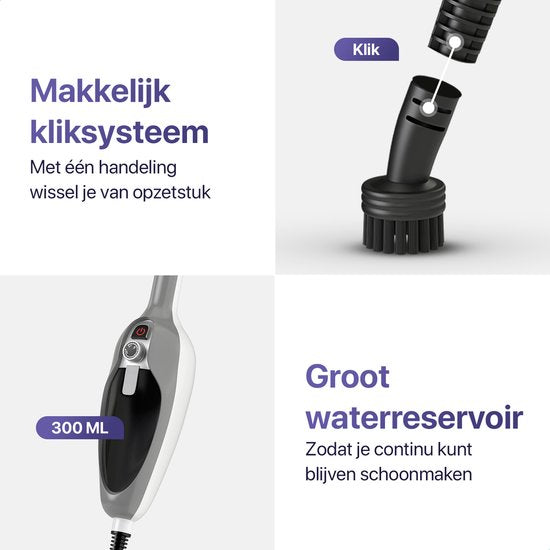 Der Luman Dampfreiniger wird mit 10 verschiedenen Zubehörteilen geliefert, mit denen Sie selbst die hartnäckigsten Flecken in Ihrem Zuhause problemlos entfernen können. Sie beginnen in der Küche? Dann ist die kleine Bürste für Herd, Grill und Fliesen unverzichtbar. Bleiben hartnäckige Flecken? Dann ist der Spachtel Ihr bester Helfer. Gehen Sie im Badezimmer ans Werk? Dann brauchen Sie die Fliesenbürste für die Fliesen. Für die Reinigung des Backofens oder der Mikrowelle ist die große Bürste perfekt. Wenn Sie Laminat- oder Holzböden haben, empfehlen wir Ihnen den großen Bodenmopp. Für Teppichböden oder Teppiche gibt es natürlich ein spezielles Teppichzubehör, und für die gründliche Reinigung von Möbeln ist das Zubehörset mit Mikrofasertuch ideal. Die Bügelbürste ist perfekt zum Glätten von Kleidung. Die gebogene Kontur eignet sich hervorragend für schwierige Ecken. Schließlich gibt es noch den speziellen Wischeraufsatz, der dafür sorgt, dass Ihre Fenster und Spiegel wieder makellos sind.