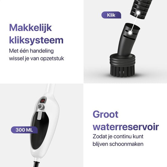 Der Luman Dampfreiniger wird mit zehn verschiedenen Aufsätzen geliefert, so dass Sie selbst die hartnäckigsten Flecken in Ihrem Zuhause problemlos entfernen können. Sie beginnen in der Küche? Die kleine Bürste ist ideal für die Reinigung von Herd, Grill und Fliesen. Sollte ein hartnäckiger Fleck zurückbleiben, ist der Schaber Ihr bester Freund. Sind Sie im Badezimmer beschäftigt? Dann verwenden Sie die Fliesenbürste für die Fliesen. Für die Reinigung des Backofens oder der Mikrowelle ist die große Bürste perfekt. Haben Sie Laminat- oder Holzböden? Dann empfiehlt sich der große Bodenmopp. Für Teppiche gibt es natürlich auch einen speziellen Teppichaufsatz, und der Mikrofasertuchaufsatz ist ideal für die gründliche Reinigung von Möbeln. Die Bügelbürste ist perfekt zum Bügeln von Kleidung. Dank ihrer gebogenen Form können Sie auch schwer zugängliche Ecken effektiv erreichen. Und schließlich gibt es noch den speziellen Wischeraufsatz, der Fenster und Spiegel wieder glänzend sauber macht.