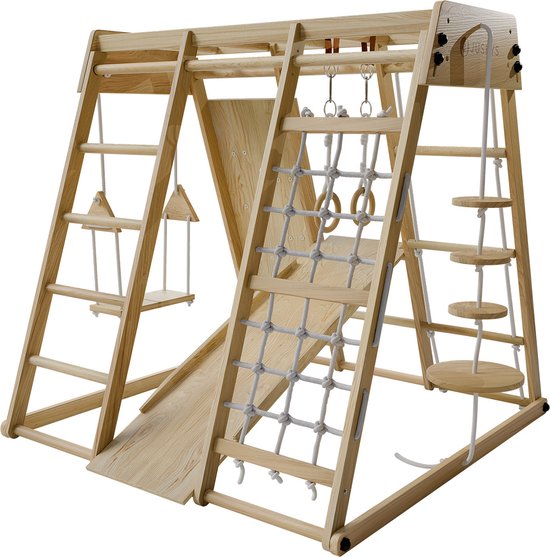 Entdecke das vielseitige maxi Kinderspielgerüst mit Rutsche, Kletterwand und diversem Zubehör. Das robuste Holzspielgerüst verwandelt jedes Kinderzimmer in einen attraktiven Indoor-Spielplatz. Hier können die Kleinen ihren Bewegungsdrang auf vielfältige Art und Weise ausleben. Ob Klettern, Rutschen oder Schaukeln, das Spielgerüst garantiert stundenlangen Spielspaß und fördert die motorischen Fähigkeiten. Es ist aus Kiefernholz gefertigt und bietet Sicherheit und Stabilität für kleine Abenteurer, die sich austoben und neue Herausforderungen suchen wollen. Die praktische Klappfunktion macht es leicht, den Platz im Zimmer wieder frei zu machen.