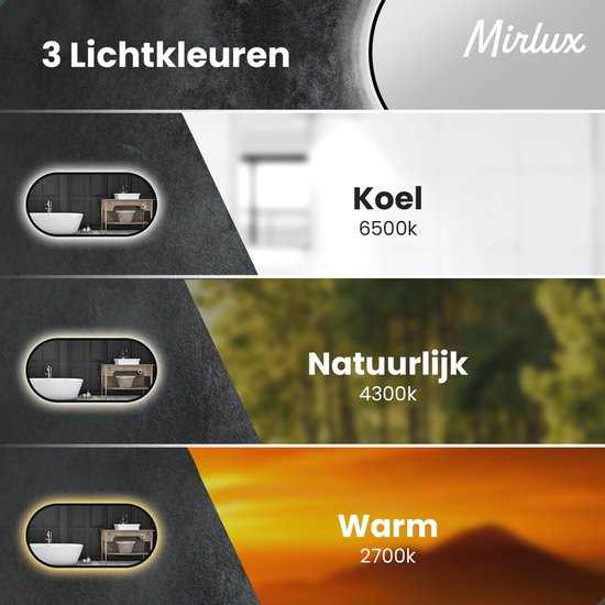 Mirlux Badezimmerspiegel mit LED-Beleuchtung & Heizung - Wandspiegel Oval - Anti-Kondensations-Duschspiegel - Schwarz - 90x50CM
