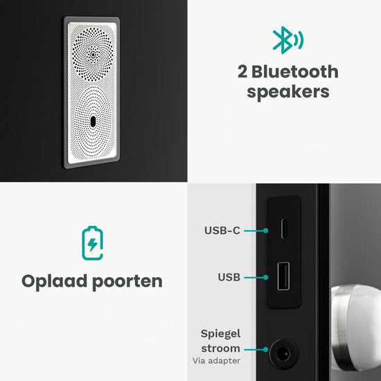 Genieße deine Lieblingsmusik, Podcasts oder beruhigende Klänge über die eingebauten Bluetooth-Lautsprecher, während du deine Beauty-Routine durchführst. Gleichzeitig kannst du dein Smartphone oder Zubehör ganz einfach über die integrierten USB- und USB-C-Anschlüsse aufladen - der ultimative Komfort in einem eleganten Design.