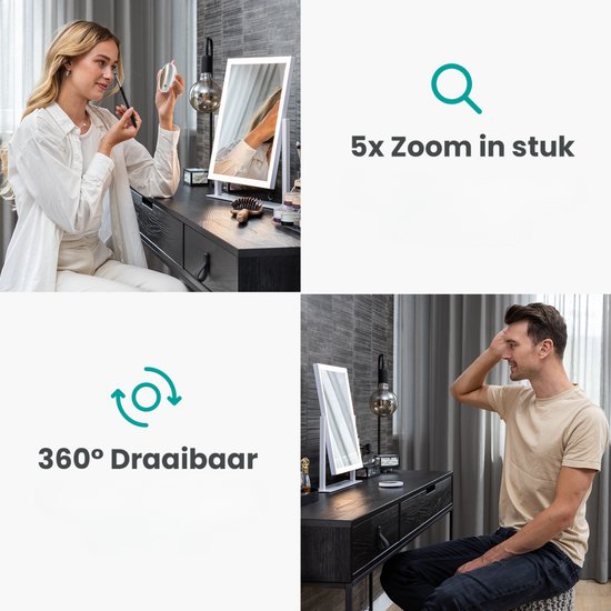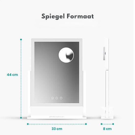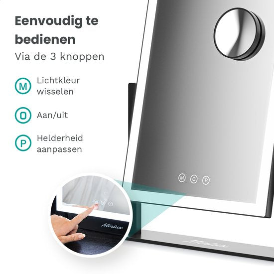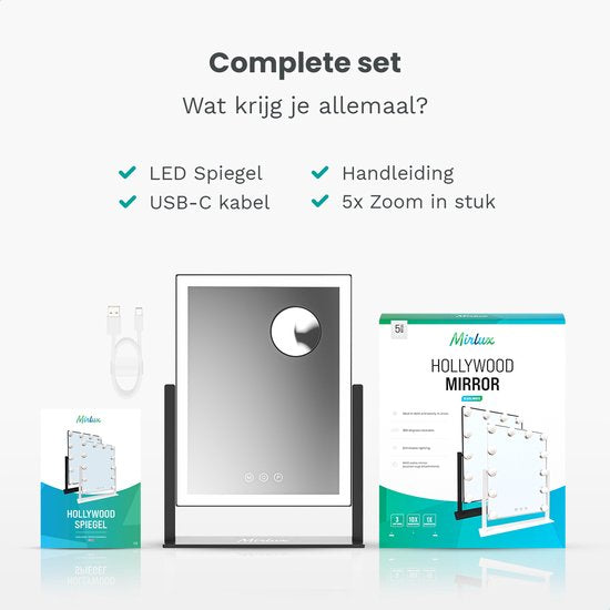 Der Mirlux Hollywood Mirror 44x30CM Black verbindet schickes Design mit starker Funktionalität. Mit seiner strahlenden LED-Beleuchtung und der 5-fachen Vergrößerung bietet dieser Schminkspiegel mit Beleuchtung die professionelle Qualität, die Sie brauchen, ganz einfach zum Greifen nah. Ideal für Make-up, Hautpflege und Hairstyling - jeden Tag.