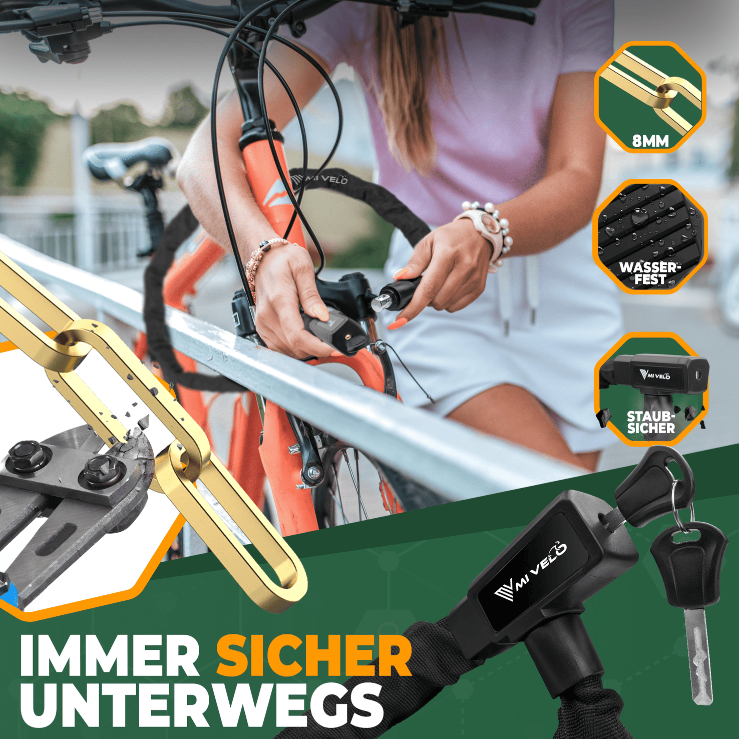 ALWAYS SAFE ON THE WAY – Mit unserem Kettenschloss mit Sicherheitsstufe 10/10 müssen Sie sich auch in Großstädten mit hohem Diebstahlrisiko keine Sorgen um Ihr Fahrrad, E-Bike oder Ihren Roller machen. Unser Safe-Secure Schließzylinder bietet optimalen Schutz vor Manipulationen ohne abzuschließen.