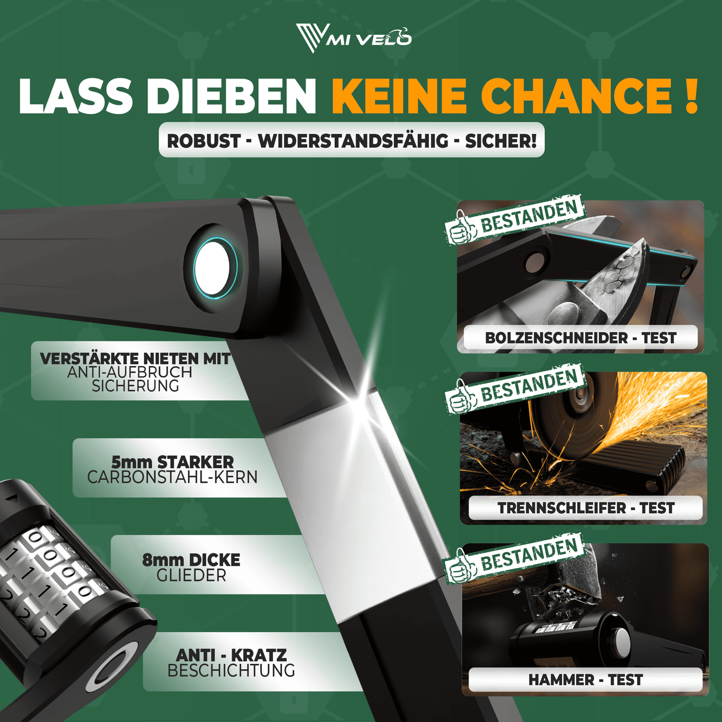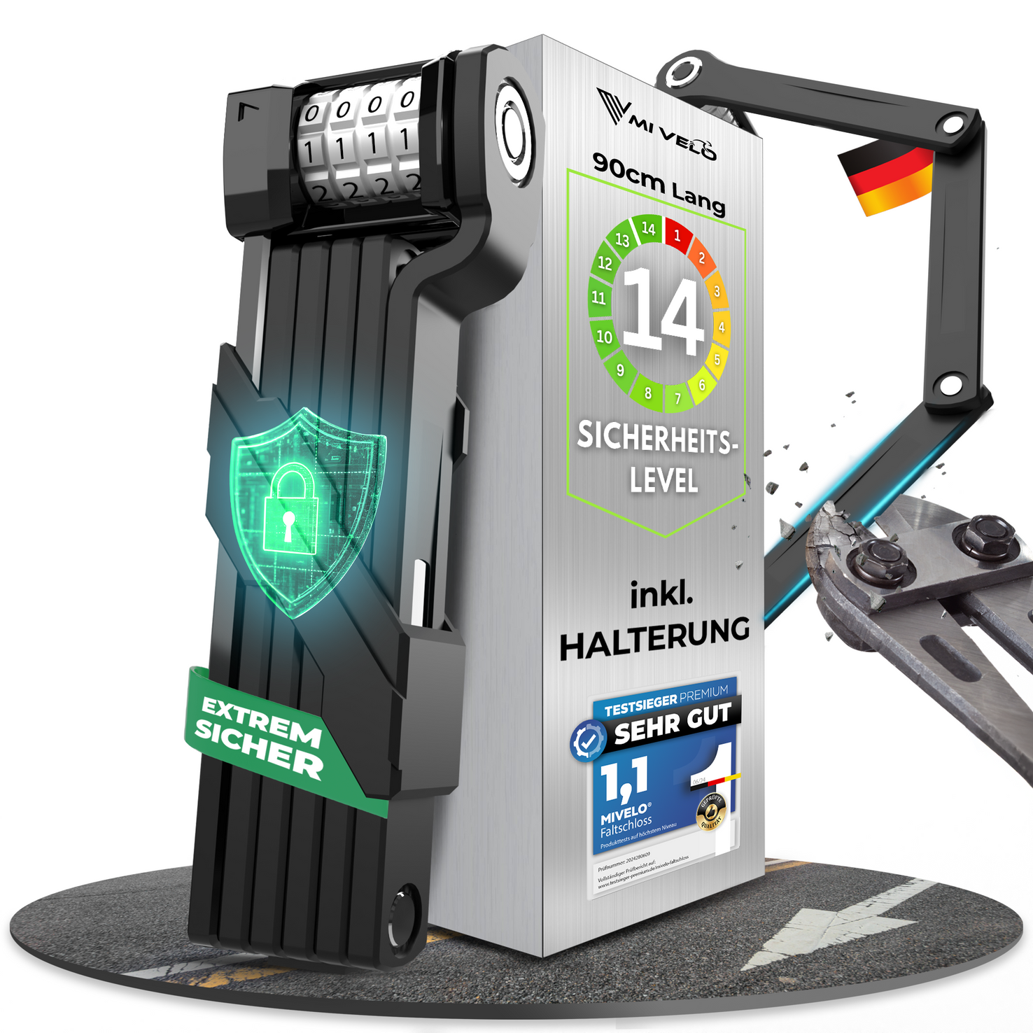 Unser Faltschloss mit Zahlencode bietet zuverlässigen Diebstahlschutz dank extra starker 8 mm Stahlglieder und langlebiger Metallzapfen. Perfekt geeignet für E-Bikes und E-Scooter, die ein Plus an Sicherheit verdienen.