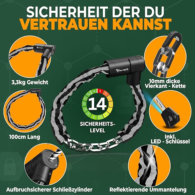 Mit dem MIVELO Kettenschloss setzen Sie auf maximalen Diebstahlschutz. Mit einer 10 mm dicken Vierkantkette aus gehärtetem Stahl und einem robusten Schließmechanismus bietet dieses Schloss ein sehr hohes Maß an Sicherheit (Stufe 14) gegen Einbruchsversuche. Ideal für Fahrräder, E-Bikes, Scooter und Motorräder.