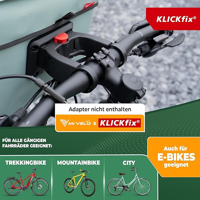 Dank der Klickfix-Kompatibilität lässt sich die Tasche schnell und sicher an fast jedem Fahrradlenker befestigen. Ob E-Bike, Citybike, Mountainbike oder Omafahrrad: diese Tasche passt immer. Der Adapter ist separat erhältlich.