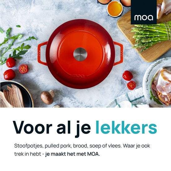 Die MOA Gusseisen-Kasserolle C26CB hat einen Durchmesser von 26 cm, ist kirschrot und hat ein Fassungsvermögen von 5,7 Litern. Mit dieser Bratpfanne können Sie die köstlichsten Gerichte zubereiten, wie z.B. Schmorgerichte oder schmorende Fleischstücke.