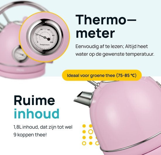 Der Wasserkocher im Design eines altmodischen Pfeifenkessels misst 23,5 x 19,5 x 27,5 cm. Mit einem Fassungsvermögen von 1,8 Litern eignet er sich sowohl für größere als auch für kleinere Haushalte, um Wasser zu kochen. Ist Pastellgrün nicht ganz Ihre Farbe? Der Wasserkocher ist auch in Schwarz und Grün erhältlich.