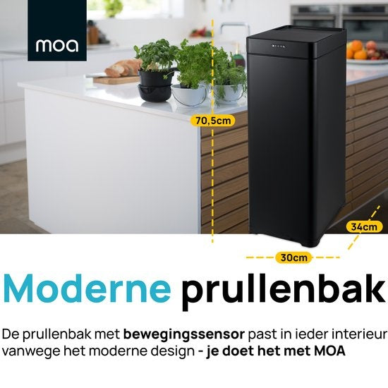 Zusätzlich zum praktischen Sensor, der registriert, ob der Deckel geschlossen werden kann, verfügt der MOA-Eimer auch über einen geräuschlosen Deckel. Dieser sorgt dafür, dass der Deckel immer sanft schließt. Der Mülleimer hat ein Gesamtgewicht von 4,5 Kilogramm und ist damit leicht zu transportieren. Er hat ein Fassungsvermögen von 50 Litern und eine Größe von 34 cm x 25 cm x 73 cm. Die rutschfesten Gummifüße sorgen für die gewünschte Stabilität.