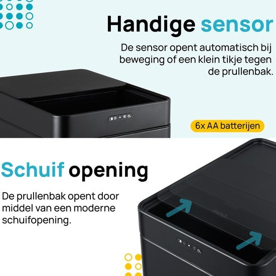 Eines der praktischen Merkmale des rechteckigen Mülleimers der Marke MOA ist der eingebaute Sensor. Dieser Sensor ermöglicht es, den Eimer zu öffnen, ohne ihn zu berühren. Das ist praktisch, wenn man zum Beispiel schmutzige Hände vom Kochen hat und den Eimer nicht schmutzig machen will. Oder wenn Sie sich gerade die Hände gewaschen haben und etwas wegwerfen wollen. Möchten Sie ihn einfach mit einem altmodischen Druck auf den Deckel öffnen? Das kannst du auch machen.
