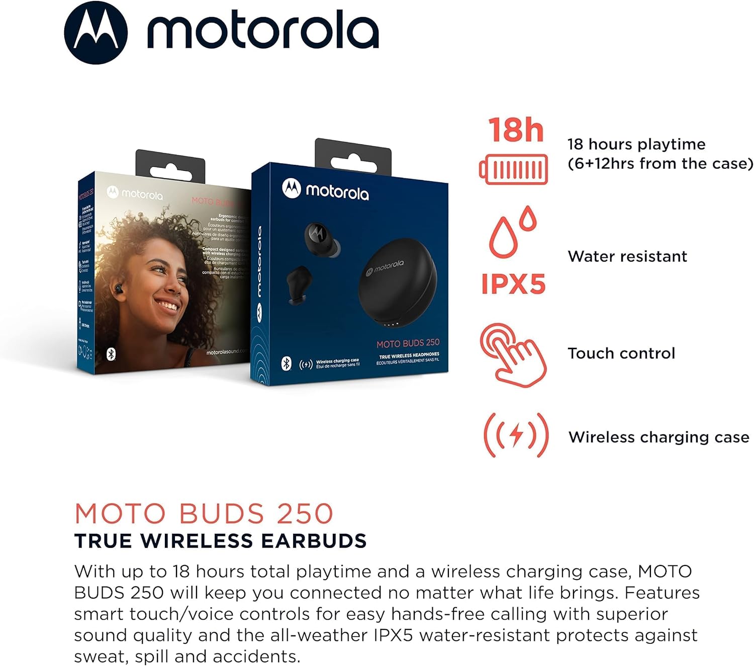 Motorola Sound Wireless earbuds - Moto Buds 250 - In-Ear - Qi-Technologie - wasser- und schweißfest - Touch- und Sprachsteuerung - 18 Stunden Spielzeit - schwarz, S/M/L